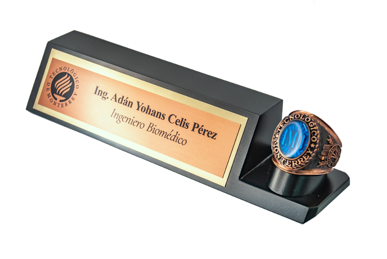 Recuerdo de graduación único en todo México, El cual lo puedes exhibir y presumir en tu casa u Oficina. Anillo metálico muy grande con piedra de resina Imitando al anillo del Tecnológico de Monterrey, Montado sobre un portanombre de madera con color negro E incluye una plaquita con su nombre y carrera.